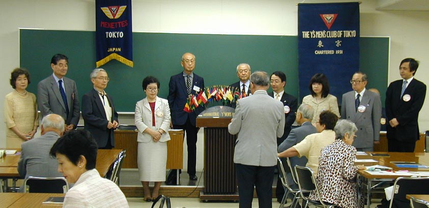 After the dinner, we approved the budget of 2003-2004 unanimously. Next, the official visit greeting: the RD Mr. Yoshio Kashimura made the speech about the policy of the new year; the DG Mr. Kageyama stated the policy of the Toshin District and appealed for the District Convention. The general manager of Tokyo YMCA Mr. Kuniji Nibori greeted: "Welcome to Toyocho!" The past RD Mr. Masanao Oyama encouraged us: "Tokyo Club and I have the same age. We will be fine together." The DSD of funds of the Toshin District Mr. Hiroyuki Sakurai explained each fund and expressed the zeal: "I will concentrate on my role."