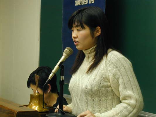 Then, we had dinner. The rice cake rolled of cherry leaf made by Ms. Tsuyuzaki added a gaiety to it. When Happy Birthday and Happy Anniversary were done, we knew that Ms. Nanami Inada, our guest speaker, was marryed just now on March 3rd. We blessed her. After that, the speech of Ms. Inada who worked as youth intern in the International Headquarters of Y's Men's Clubs in Geneva. She had the motive to work there when she wanted to work abroad and contribute to the international community. When she traveled in Egypt and Turkey, she saw the miserable state where the children must work weaving; she thought them pitiabe and she weeped. However, they smiled to her and she wanted to return this smile to them. The languages troubled her most because 5 youth interns who worked in IHQ were an Uruguayan, a Scottish, a Malaysian, a Swede and a Japanese. Her work were preparation and planning of the youth convocation; editing of the magazine "Youth World"; information on youth; reception of the members of International Parliament in Mid-Year Meeting. When she was accompanied to events or conferences, local Y's men treated her like their grandchild. During the term of youth intern of one year, she had various discoveries which crossed cultures. Now she feels no wonder whatever breaks out. She had very good experiences. We heard a very interesting story.
