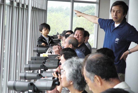 In the hangar of observation, Ms. Junko Hasuo who concerns it from its establishment talked about the history, the act of man, the geography and the environment in this protection ward. We learned much about the necessity and difficulty of the maintenance of the protection ward in the downtown place. We walked on the green tract of land, visited the protection ward and returned to the hangar of observation. We observed wildfowls respectively with the well maintained telescope of equipment pleasantly.