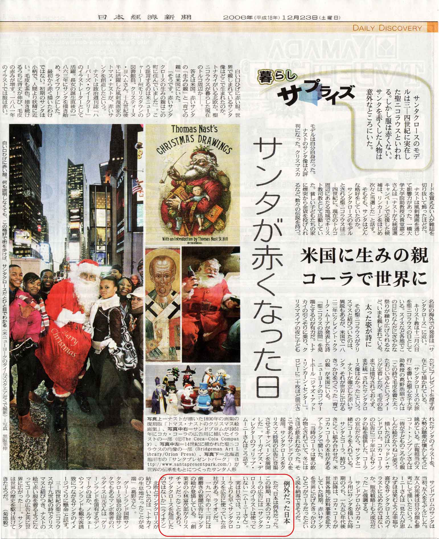 「今日(2006/12/23)の日経新聞に楽しいサンタの話が載っていました。ご覧になった方もいらっしゃると思いますが転載します。赤いサンタの生みの親は米国のトマス・ナスト。当初は赤い服を来ていたわけではなく、1881年頃から赤くなった。世界に広がるきっかけはコカコーラの広告。1950年代だったという。しかし日本は例外でこれより早く1916年12月のライオン歯磨きの新聞広告で。当時社長で創業者の小林富治郎(ママ)さんがクリスチャンだったからという。ご存知のように小林さんは東京ワイズメンズクラブのチャーターメンバー、 楽しい話です。」