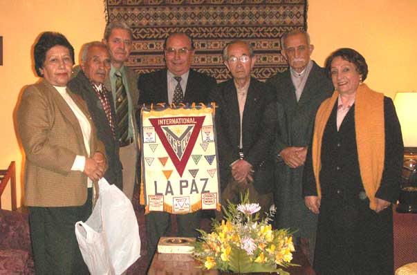 2006年4月1日朝7時に、旅行社MickeyTourの車のホテルでのピックアップを受け、リマ空港へ。8時30分発クスコ行きに搭乗することとなった。それ以後はアンデス山脈高原地域にあるインカ遺跡見学の個人旅行の旅として別途記載することにし、2006年4月6日、個人旅行中チチカカ湖の中間地点、ペルー側出国地点ユングーノ、ボリビア側入国地点コパカバーナで出入国手続きを行う。旅行社のボリビア側の日本語案内者のマルセラ・メルカドさん(Sra.Marcela Mercado)からラパスワイズの出迎え先まで案内され、翌日の歓迎会の通訳まで無料で引き受けるとの歓迎ぶりで、コパ市内の案内と昼食の歓待で湖畔を見学後、水中翼船でウアタハタ港経由陸路バスにて豪雨の中2時間を要して、7時半所定のグランドホテルへ到着し、アントニオ・モレノさん等10名のラパスワイズメンの賑やかな歓迎を受ける到着だった。ハイメ・サパタ=アリアガ(Sr. & Sra. Jaime Zapata-Aliaga)さんご夫妻がこのラパス帯在中の宿泊先であることの紹介を受け、1時間近く歓談後、ご夫妻の車に便乗し起伏の多い夜道を20分位で、静かな住宅地にあるお宅に案内されて、南米での最初のホームステイの一夜を迎えることとなった。サパタさんは東洋工業マツダのボリビア代理店をされていたようで、2度程来日経験を持っておられ既に引退されていて、2人のお子様も既に嫁がれていて、2階のシャワー付きの広い部屋を準備していて下さり、家を細部に亘り案内して廻り、アットホームを味わうよう計らって下さり、安らかな眠りに就くことが出来た。