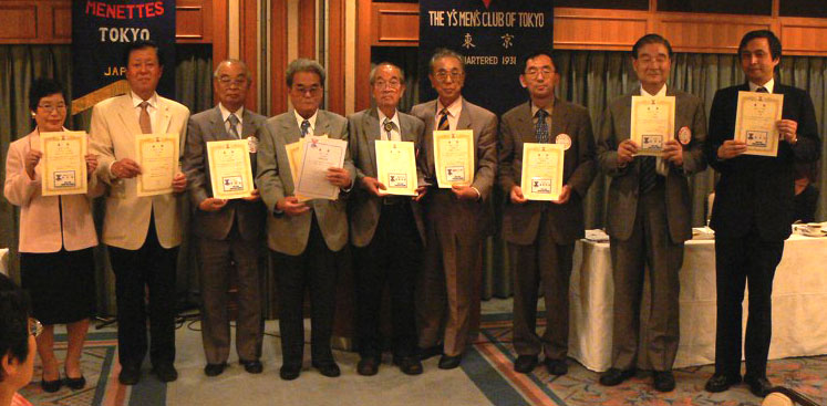 1年間を振り返って松田会長が挨拶。「2回目の会長は前代未聞のこと、無事終えられた。今年度は最優秀クラブ賞を獲得するなど15の賞をいただいた。大きな成果を得た。75周年行事も大成功だった。メン、メネットのご協力の賜であり感謝している。みんなでよくやった1年だった」と今年度の活動を振り返って総括。各事業委員会の受賞を報告し、会長、各委員長と並んで賞状を手に記念撮影(下の写真)、会長、各委員長の1年間のご苦労にメンバー一同ねぎらいと感謝の拍手を送った。